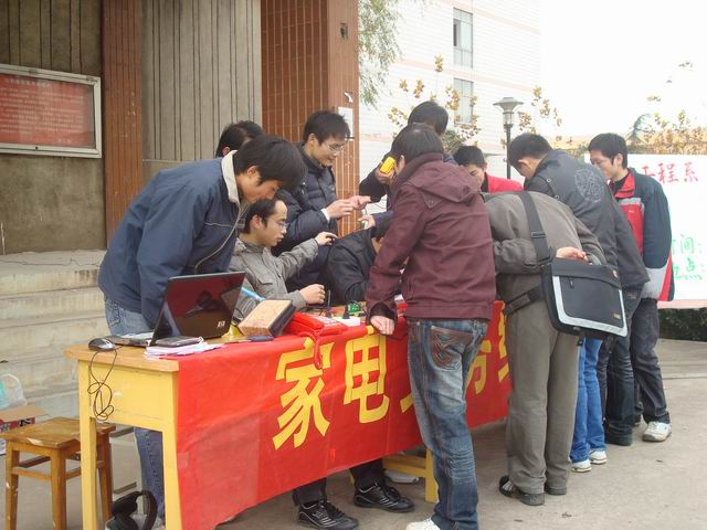 根据第八届院大学生课外学术科技节活动的安排, 12月5,由电气工程系团总支主办、电子科技协会协办的家电义务维修活动在院学术报告厅旁举行。下午2:00,电子科技协会的同学就早早的摆好工作台,开始了近三个小时的维修活动。