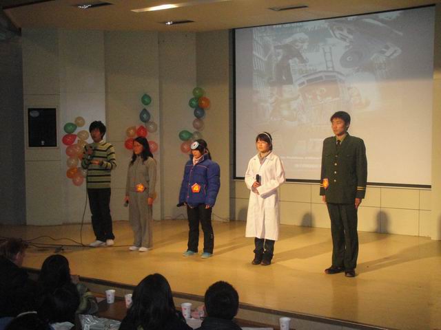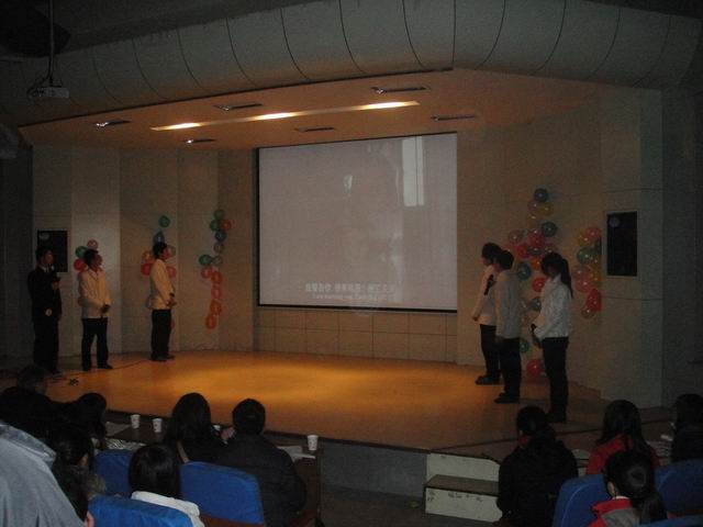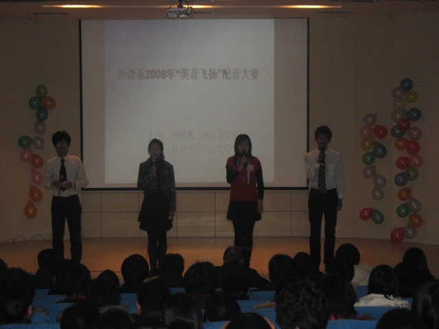 12107:00,由外语系和机电学院团总支、学生会共同主办的2009年英语电影配音大赛决赛在学术报告厅举行。本次大赛吸引了来自外语系英语专业、机电学院英语专业及“Lemon Tree”外文社、“Langue Tower”翻译社、EYE口语协会和T-CET驿站等协会的全院广大英语爱好者,共有28支队参赛,经选拔有15支队进入决赛。决赛现场座无虚席,气氛热烈。外语系骨干教师和外教应邀担任大赛评委。